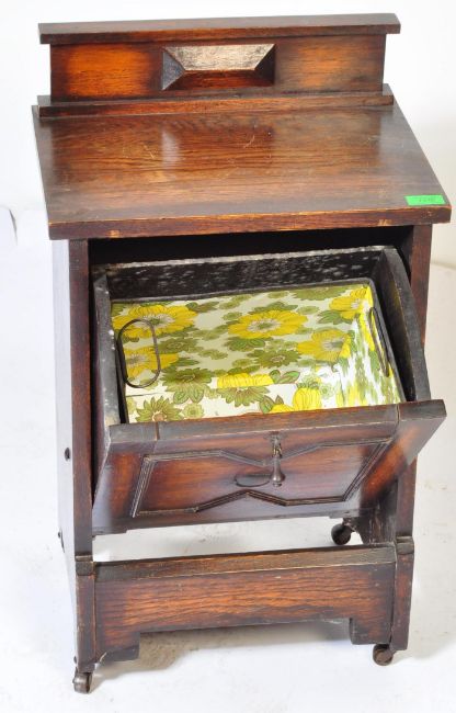 A 20th Century circa 1920's Purdonium oak coal cabinet. Of square form with gallery geometric back, with a single upright sliding opening door, with a tin floral interior. Measures approx 69cm x 42cm x 32cm.