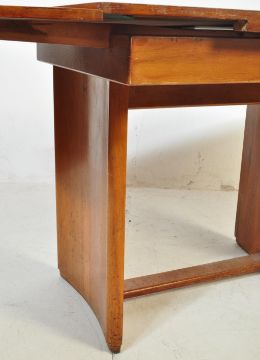 An early 20th Art Deco century walnut draw leaf dining table having quarter panel veneer with central satinwood and burr walnut detailing. Measures 75cm x 95cm x 75cm. Extended 148cm length.