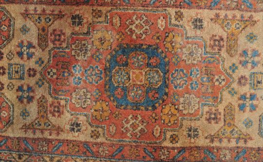 An assortment of three vintage 20th century rugs to include a Persian manner rug with olive ground and decorative medallions, a Turkish manner prayer rug with red ground and red and black border. Together with a black and red carpet with three central medallions. Rugs measuring 117cmx 77cm // 82cm x 162cm // 170cm x 62cm.