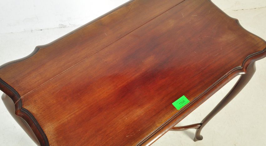 A 19th century Victorian mahogany side table occasional table having serpentine edges, pierced apron raised on cabriole legs united by a stretcher. Measures 70cm H x 66cm W x 40cm D