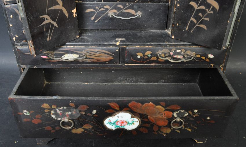 A 19th century Chinese black lacquered table top cabinet having hand painted gilt floral decoration with porcelain panels and decorative brass handles and mounts. The cabinet having a lift up top over a series of drawers with central twin door cupboard over a bracket base. Condition commensurate with age - hinges to lid in need of small repair and scuffs to wood. Measures 52cm x 33cm x 16cm.
