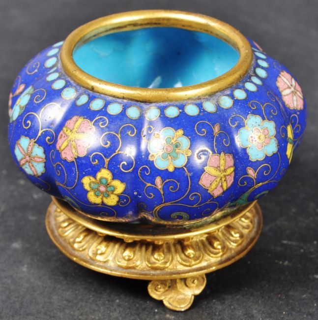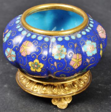 An 18th Century Chinese Cloisonne censer ding prayer bowl incense burner on stand. The bowl having intricate cloisonne work with segmented form body decorated with floral medallions. Raised on a gilded bronze stand. Measures approx; 6cm tall.