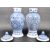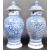 A pair of 19th Century Chinese Qing Dynasty blue and white urn vases of bulbous tapering form. Each having shaped lids atop with waisted necks below. Floral and patterned decoration to each with bat detailing to the necks. Each bearing six character marks to the bases. One lid having chips with each having minor wear commensurate with age. Each measures approx; 36cm x 14cm diameter.