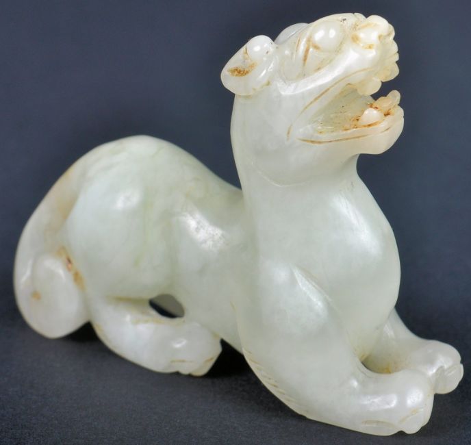 A 19th Century Chinese Qing Dynasty Oriental hand carved jade figurine in the form of a Foo Dog / Dog of Fo. The figure modelled seated / reclined with paws outstretched and head facing up with jaws up. Measures approx; 5cm x 6cm.