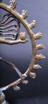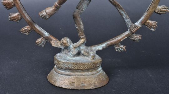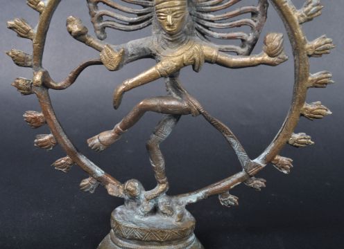 An early 19th Century bronze figure depicting Nataraja, Hindu god Shiva, performing the tandava natyam dance, trampling Apasmara (the dwarf of ignorance).The figure standing on one leg with four arms holding sacred objects in a ring of fire raised on stepped lotus base. Condition; age related wear & tarnishing to be expected but no signs of major damage or repair. Measures approx; 21cm x 20cm.