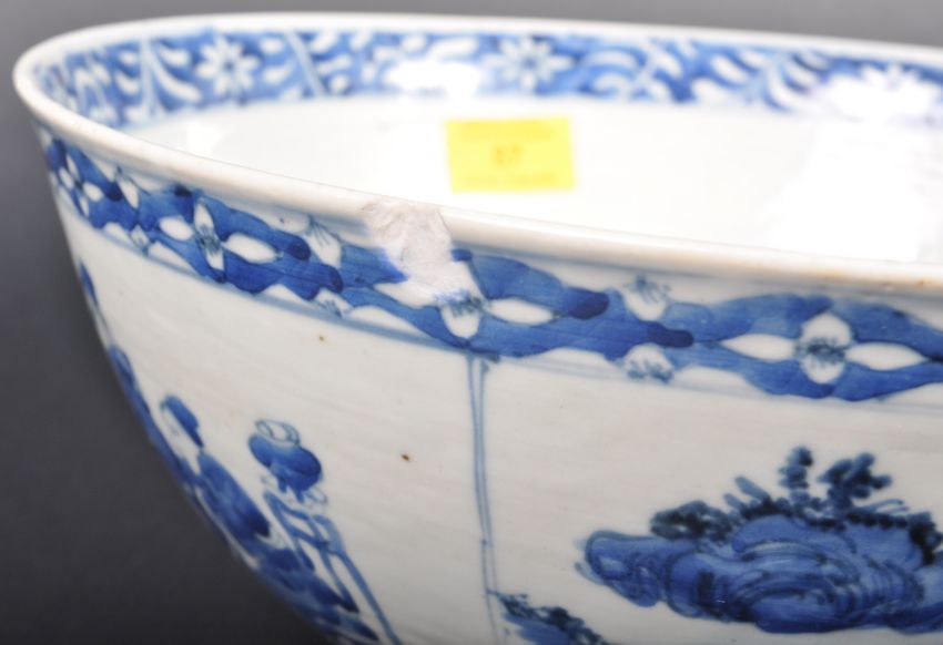 An early 20th Century Chinese Xuantong mark & period blue & white porcelain bowl. The bowl of large size with hand painted scenes depicting figures playing games at table and landscapes. The central well of the bowl decorated with another landscape scene and the border decorated with repeating botanical decoration. The underside with four character mark in underglaze blue. Chip to rim and hairline present. Measures approx; 12cm x 29cm.