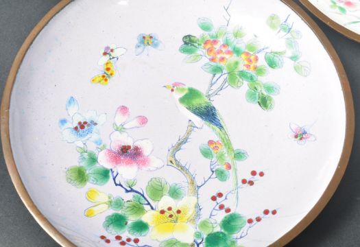 Three early 20th Century 1920's Chinese enameled copper dishes with two having white enamel ground with floral decoration and butterflies. The third having pink ground with a single bird of paradise to the center. Each marked China to th base. Wear commensurate with age throughout. Each measures approx; 16cm diameter.