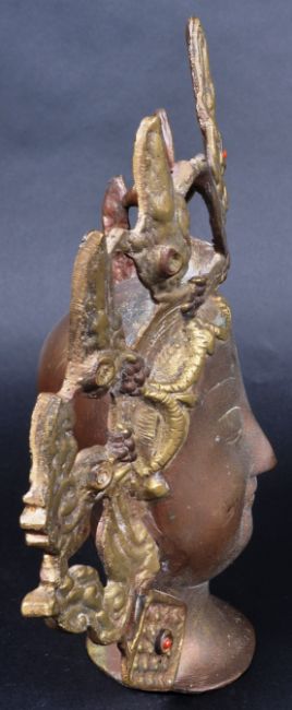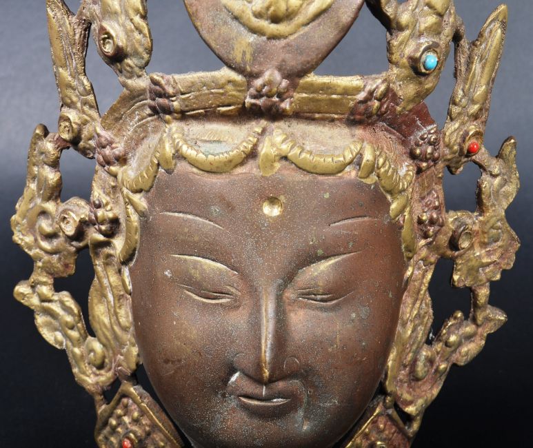 A 19th Century bronze Tibetan / Oriental dipankara Buddha head. Depicted with a peaceful expression & adorned with an elaborate headdress / crown inlaid with stones (possibly turquoise & coral). Condition; age related wear & tarnishing to be expected but no signs repair however a few stones missing from original settings. Measures approx; 23cm x 18cm.