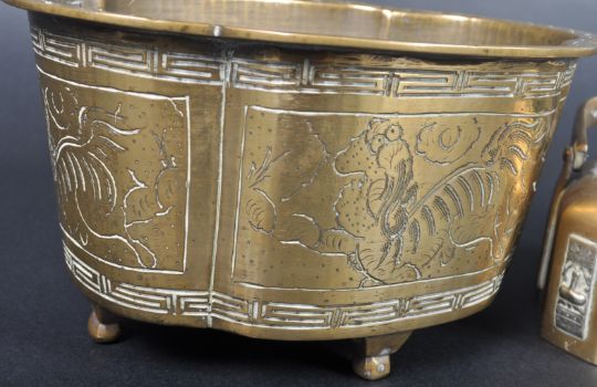Two pieces of early 20th Century Chinese bronze / brass comprising a swing handles censer / incense burner decorated with relief cast panel along with a jardinier decorated with repeating key pattern and naive scenes raised on four small feet