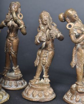 A collection of 19th Century Indian Hindu bronze female musician figures. The band playing an assortment of instruments all standing atop lotus pedestals. Each lady with their hair in a bun, bindi to forehead, traditional jewellery & typical robes. Condition; all with wear & tarnishing commensurate with age. Measure approx; 10cm x 4cm.