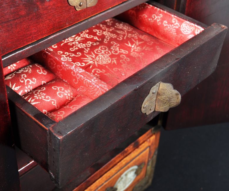 A 20th Century Chinese hardwood and jade panel set jewellery cabinet box. The cabinet having twin doors set with carved jade panels opening to reveal a series of fitted & lined drawers. Shanghai makers plaque to verso. Measures approx; 28cm x 19cm x 15cm.