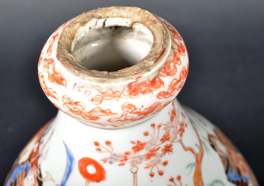 A 19th Century Japanese Meiji Period Arita ware porcelain vase. The vase hand painted in an Imari palette decorated with scenes of Samurai in armour among blossoming trees in campsite. Six ochre marks to underside. AF. Measures approx; 24cm tall.