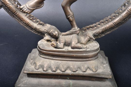 A large 19th Century Indian Hindu bronze figurine depicting Shiva / Siva Nataraja the Divine Dancer. The figure standing on one leg with four arms holding sacred objects in a ring of fire raised on stepped lotus base. Measures approx; 44cm x 37cm.