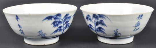 A pair of 19th Century Chinese blue & white porcelain bowls. Each bowl having hand painted decoration depicting provincial scenes of trees with poem / script in Kaishu. Botl bowls raised on small circular foot with painted mark to underside. Measures approx; 5cm x 12cm.