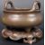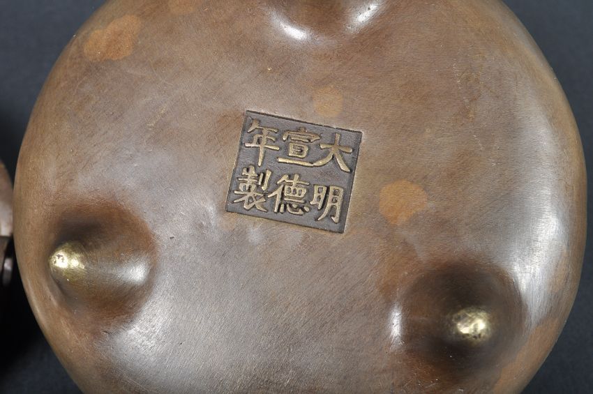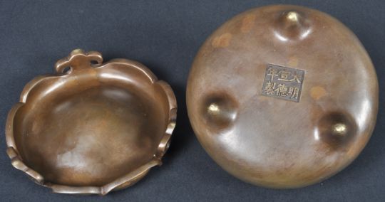 An early 20th Century Chinese Oriental bronze censer ding incense bowl having shaped body with open loop handles raised on matching stand. Ming Xuande marks to the base. Measures approx; 12cm x 13cm diameter.