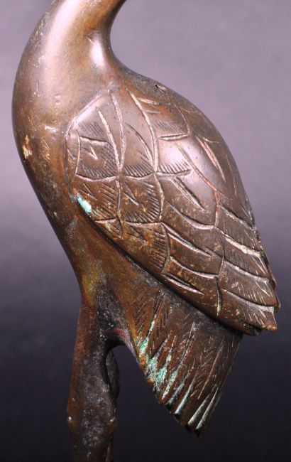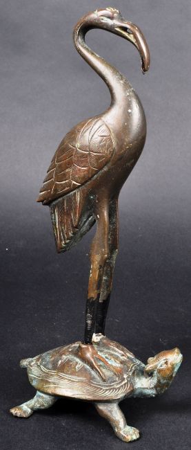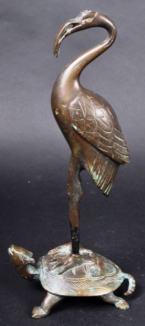 A 19th Century Japanese / Oriental bronze depicting a bird & turtle. The crane standing atop the turtle's shell is associated with longevity and prosperity. Condition; age related wear to be expected with signs of repair to the cranes legs. Measures approx; 23cm x 11cm.