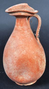 A collection of three Ancient pottery pieces comprising a Vallanovan Skyphos twin handled bowl circa 7th Century BC, Roman Terracotta bowl and a larger Roman terracotta single handled ewer jug. Measures approx; 18cm.