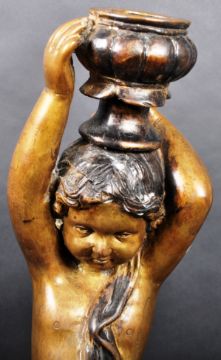 A pair of large 19th Century bronze figural candlesticks in the form of cherubs. Modelled as a cherub / putti holding candle sconce above head with cloth draped standing on a trefoil plinth pedestal base. Measures approx; 65cm tall.