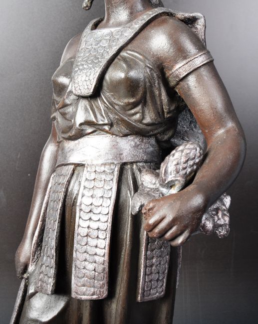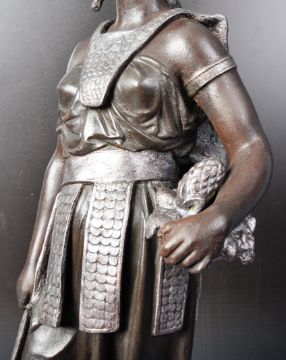 A pair of late 19th Century Victorian bronzed spelter figures of Native Americans. Each moulded in a standing position with the man holding a spear and a shield while the woman holds a tray with a pineapple under one arm and a large implement under the other. Each raised on a circular ebonised base. Wear commensurate with age, overall good. Measures approx; 67cm x 21cm.
