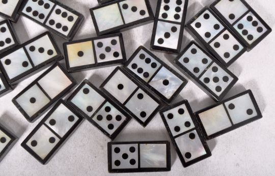 A fine set of 19th Century mother of pearl and ebony dominoes. The seat complete and housed within a specimen wood inlaid fitted case with push button latch.