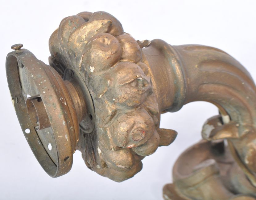 A matching pair of 19th Century Victorian carved wooden wall light sconces converted to electric with each having scrolled and foliate carved detailing throughout. Each having a gilt finish and comes with a flambe glass shade with one in pink and the other green. Wear commensurate with age. Each measures approx; 40cm.