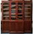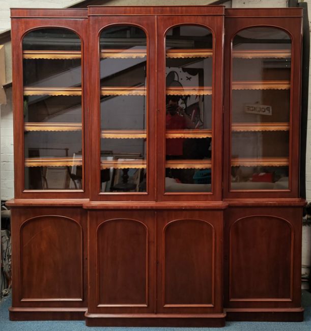 A large 19th Century Victorian mahogany breakfront library bookcase. Comprises a large central bookcase flanked by two smaller examples with arched glazed doors raised on a breakfront cupboard base with fitted pediment top. Dismantles into five section for ease of movement. Measures approx; 236cm x 230cm x 60cm.