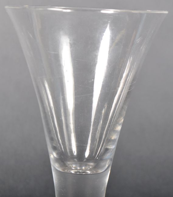 An 18th Century George III glass wine drinking glass having a pulled trumpet bowl with plain stem over a conical circular foot. Measures approx; 18cm tall.