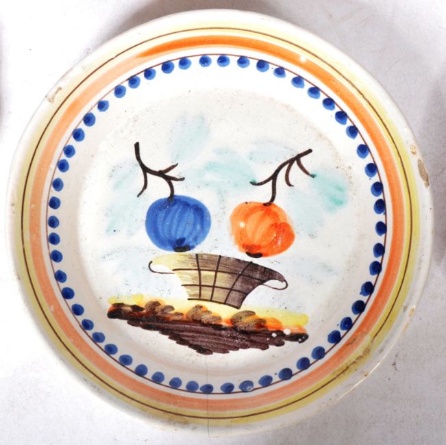 A selection of 18th to 19th Century French Faience tin glazed plates with each having flared / lipped rims with hand painted decoration throughout. Wear commensurate damage with some chips. Largest measures approx; 28cm diameter.