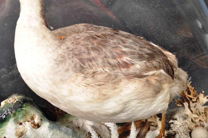 Taxidermy & Natural History - Podiceps Cristatus - A large 19th Century Victorian taxidermy bird display comprising of two Great Crested Grebe birds set to a naturalistic rocky outcrop with coral and other marine life. One of the birds seated within faux pond effect glass panel. The large glass dome raised on wooden base with bun feet. A very well presented example appearing in good condition overall. Measures approx; 67cm x 53cm.