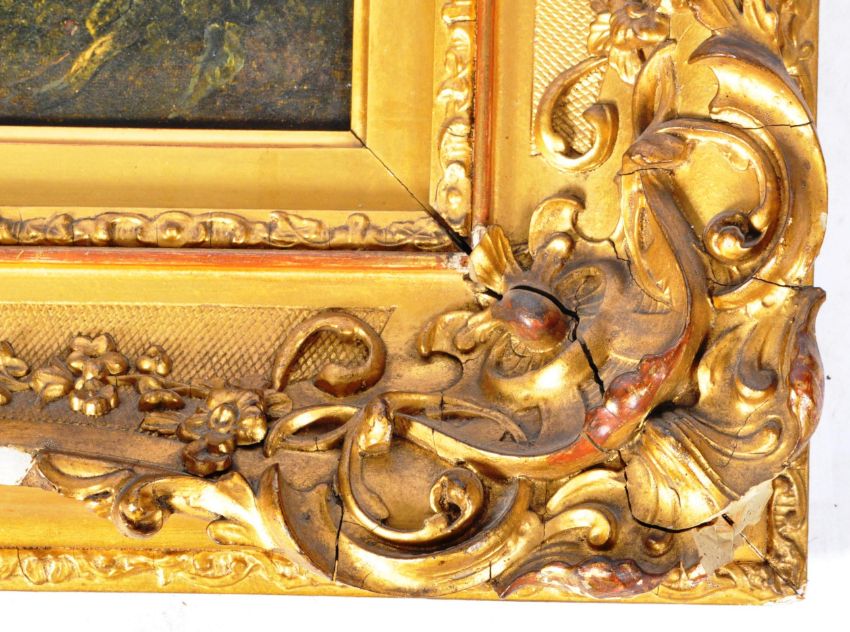 Patrick Nasmyth (b. 1787-1831) - A 19th Century George III Scottish oil on canvas landscape painting depicting cottage lake scene with a figure on horseback lead by another. Forest to the backdrop with all set within a gilt frame with foliate and scroll detailing. Wear commensurate with age mostly to the gilt frame, overall good. Measures approx; 52cm x 62cm.