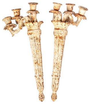A pair of 19th Century Victorian cast iron wall mounted wall sconces in the manner of Coalbrookdale. The pair influenced by Adam designs and having triple scroll arm sconces with central tapering wall mounts. Later screws / fittings present. Finished in a white paint. Measures approx 45cm long.