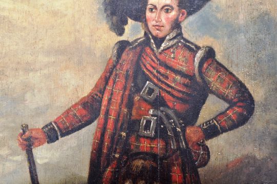 A 19th Century Scottish oil on board portrait painting study depicting a soldier in Highland Military dress attire wearing a tailored kilt and holding musket / rifle. Set to a later gilt frame. Frame measures approx; 79cm x 62cm