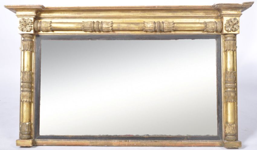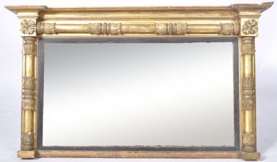 A 19th Century Victorian gilt gesso wood over mantel wall mirror of rectangular architectural form. The mirror panel housed within a column set frame with the corners carved with rosettes. Some wear to the frame but overall in good condition. Measures approx; 78cm x 137cm.