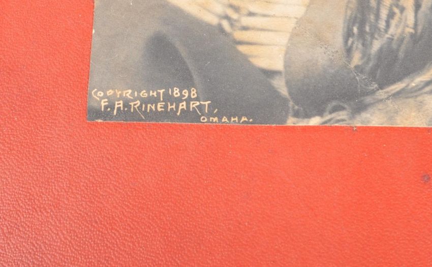 A pair of 19th Century photographs depicting Native Americans by FA Rinehart, Omaha 1898. Comprises an example depicting Louison of the Flatheads and Chief Hollow Horn Bear of the Sioux. Both set in red card borders. Measures approx; 24cm x 18cm (image only).
