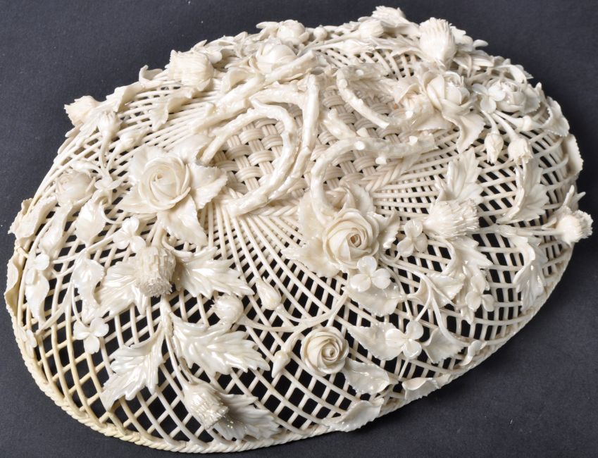 A first period (1865-1889) Belleek porcelain basket and cover of large size with pearlescent glaze. The cover and base ribbon decorated with repeating woven bands decorated with natural form wove branch cover with applied flower heads and leaves. The edge decorated with interlocking bands. By repute previously restored by the V&A. Measures approx; 11cm x 33cm x 25cm.