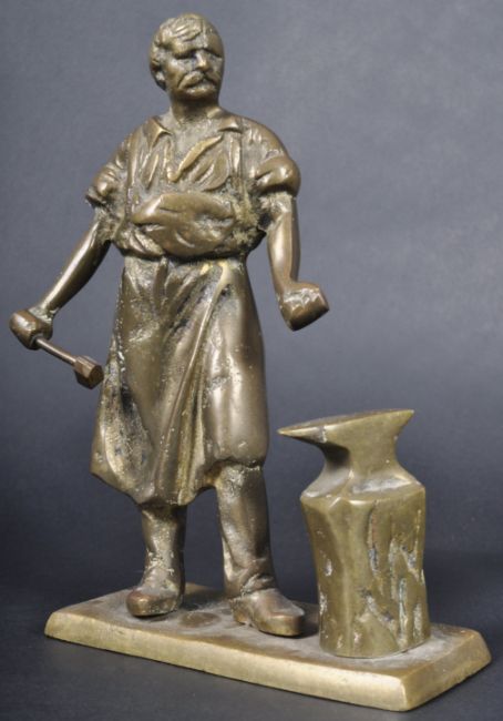 A 19th Century Victorian bronze figurine. The figure depicting a blacksmith standing by anvil with smithing tools in hand. Raised on plinth base. Measures approx; 20cm x 13cm x 6cm.