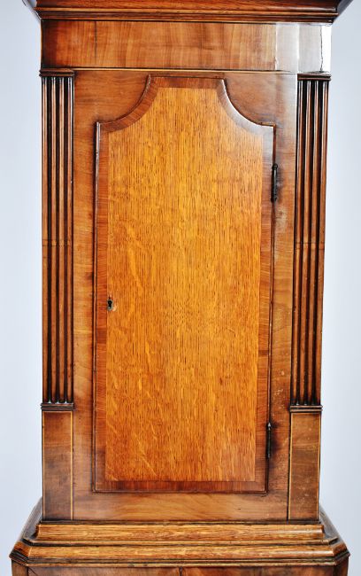 A 19th Century Victorian mahogany and oak cased longcase grandfather clock by Nathaniel Dumville of Stockport. The painted face signed and having Roman numeral chapter ring with moonphase above. The case with arched glazed door, fitted door to trunk and veneer details. Measures approx; 225cm x 52cm x 23cm.