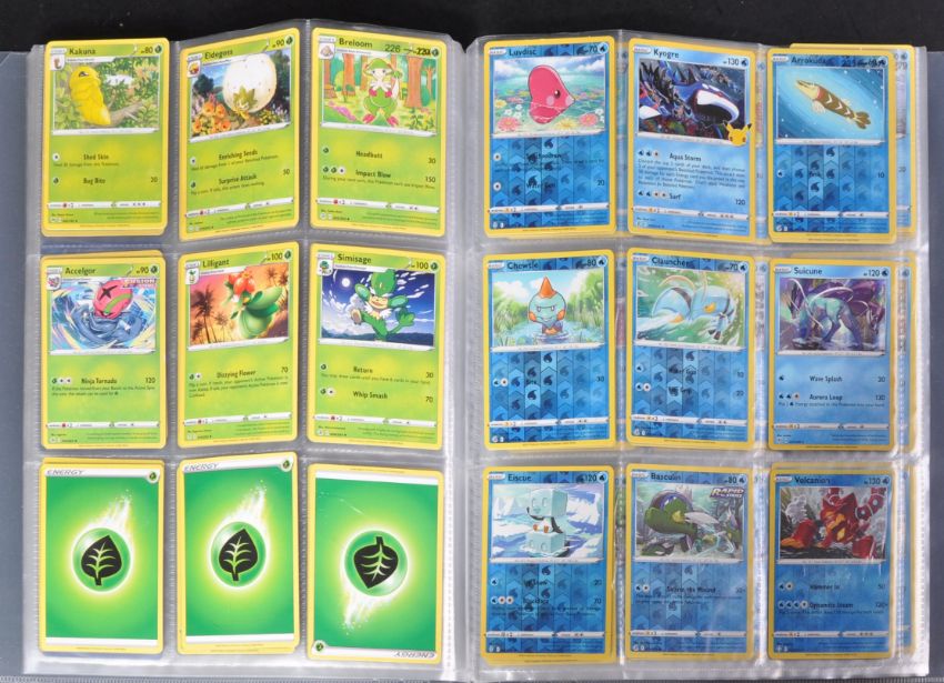 Pokémon Trading Card Game - a large binder of assorted Pokémon cards from sets in 2020 and 2021. Cards from Celebrations, Chilling Reign, Battle Styles, Evolving Skies, Fusion Strike, Shining Fates and others are present throughout with notable cards to include; Kyogre 003/025, Palkia 004/025, Blastoise 2/102 and Milotic 039/189. There is a nice selection of reverse holographic cards and all cards generally appear to be pack fresh.