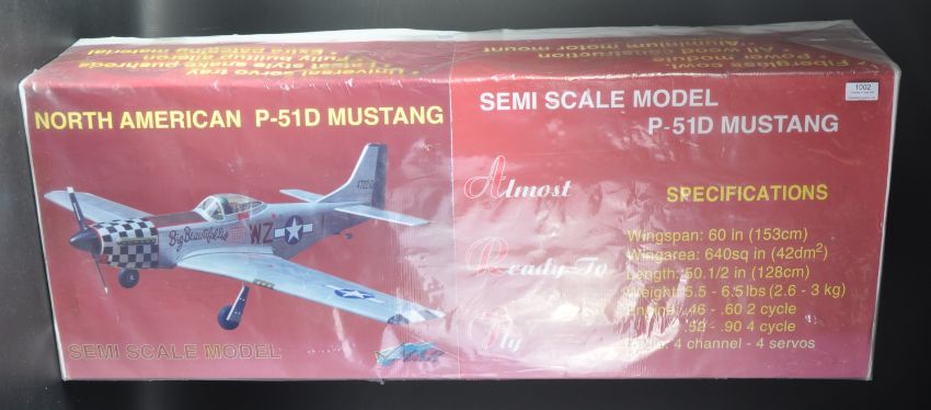 A large scale Vmar made North American P-51D Mustang ARF ' Almost Ready To Fly ' model kit. The factory sealed kit having a 153cm wing span, all wood construction with a fibre glass cowl, power module and aluminium motor mount.