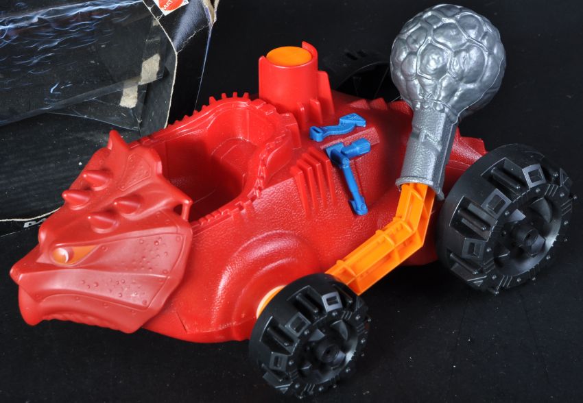 Masters Of The Universe - an original vintage 1980s Mattel made MOTU action figure playset vehicle ' Bashasaurus '. Appears complete, with working bashing action. Housed in its original box (tatty).