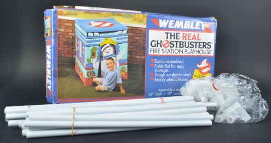 An original vintage Wembley made ' The Real Ghostbusters Fire Station Playhouse '. Original box and plastic frame only. Measures approx 100 x 84 x 84cm.