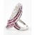 An Art Deco platinum, ruby and diamond dress ring. The ring of crossover design set with calibre cut rubies and pave set round cut diamonds. Unmarked, tests indicate platinum. Head measures 3.3cm. Largest diamond measures 4.2mm diameter. Weight 12.6g. Size N.5.