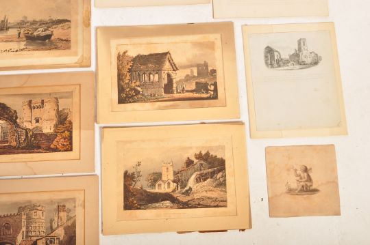 A collection of V19th century Samuel Prout (1752-1852) watercolour lithograph prints. Published 1819, R. Ackermanns, 101 Strand. Accompanied by two Stead etchings depicting St Peters Church and Norwich Cathedral.