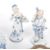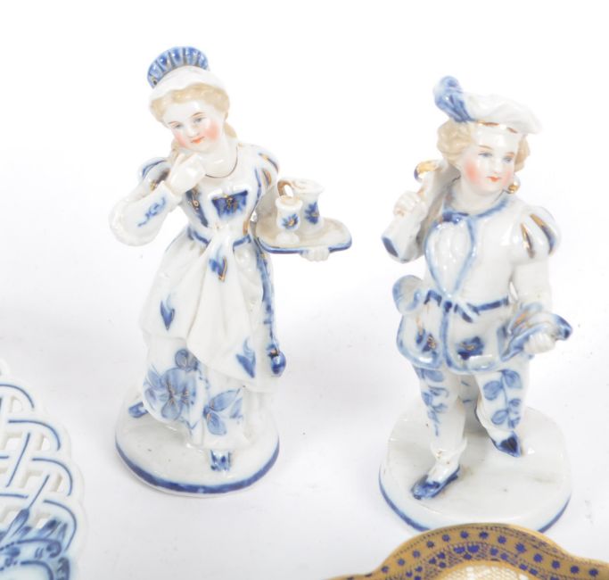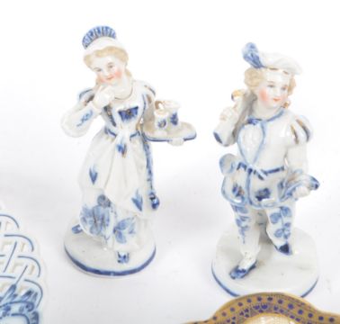 Mid to late 20th century collection of china plates and porcelain statuettes. The lot including Derby China, "Red Aves" collection (discontinued 1997) small pedestal dish with faunistic decorations and lined golden patterns around the edges. It measures approx. 14cm width and 4cm height. A ribbon pierced white and blue Meissen Germany dish, measuring approx. 23cm in diameter. Pair of porcelain statuettes of 18th century man with crossbow in hunting clothes and lady in maiden clothes with a tray of glasses in her hands. They measure approx. 13cm height. Pair of Bishop England cake plates in cream with golden and cobalt blue decorations with handles. They approx. measure 24.5x21cm.
