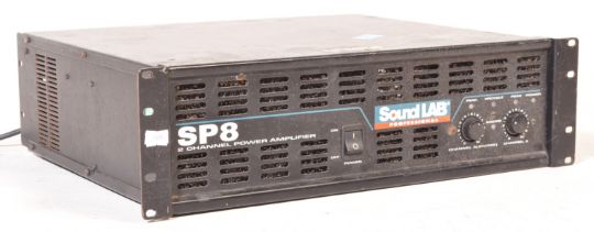 A vintage 20th century Soundlab SP8 amplifier offering one 400 watts at 4 ohms and one 500 watts at 2 ohms per channel. It comes in black with switch on and off button in the centre and knobs on the right side of the board. It appears in overall good conditions with minor wear commensurate with age. measures approx: 13cm x 48cm x 41cm
