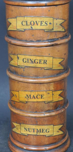 A 19th century Victorian style reproduction treen spice tower having four tiers with applied spice labels for Cloves, Ginger, Mace and Nutmeg. Measures 20cm tall.