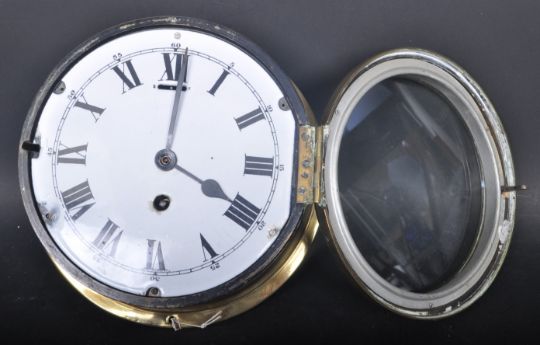 An early 20th century ships bulkhead clock having 7-day movement with roman numerals on  white enamel dial  being set in a polished brass case.