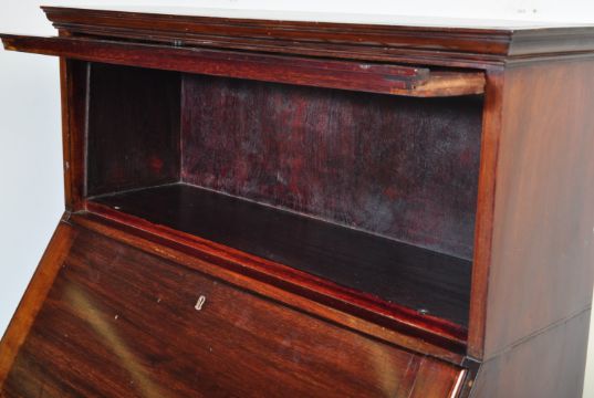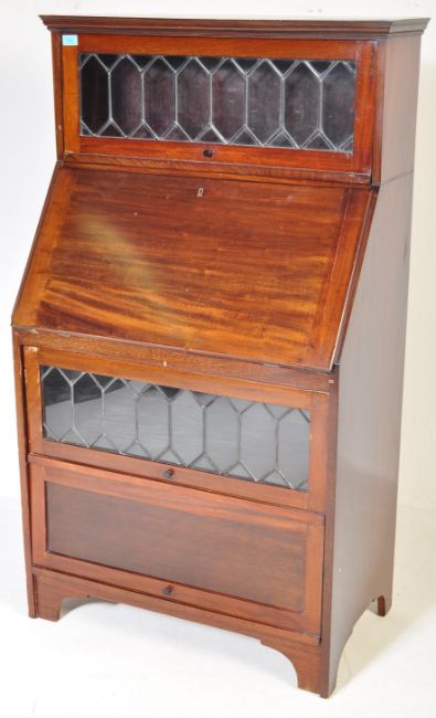 A Victorian 19th century mahogany art nouveau inspired bureau bookcase. The bookcase having a leaded glazed cabinet atop of a writing bureau with fully appointed interior over two further cabinets raised on bracket feet. Measures approx: 138cm x 44cm.
