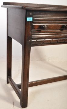 A 20th century Jacobean style oak lowboy side - writing table desk. The desk having a gallery back with 2 drawers and knob handles. Raised on square legs united by a h-stretcher. Measures approx. 76cm x 91cm x 50cm.