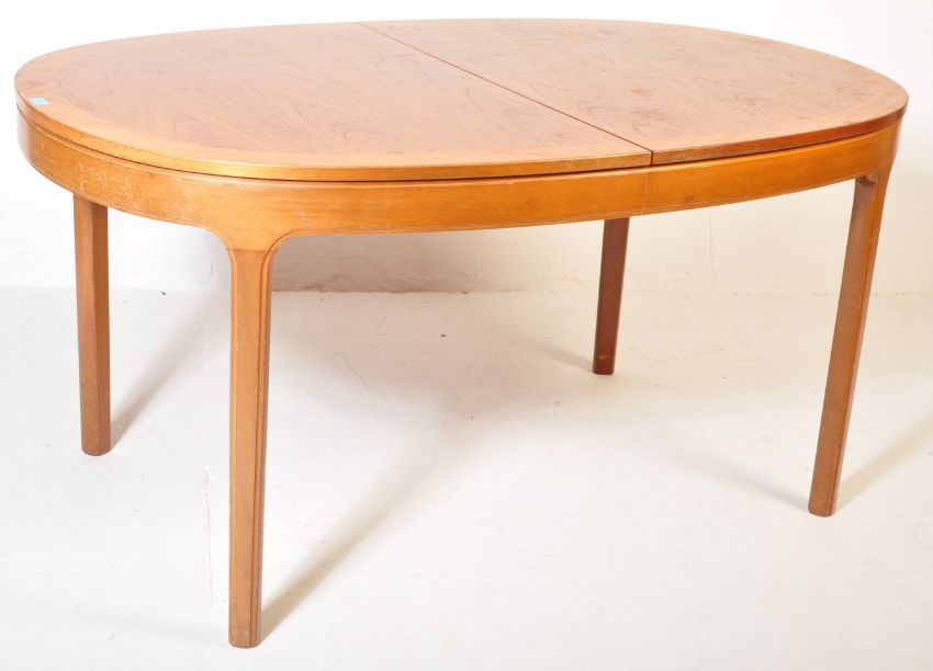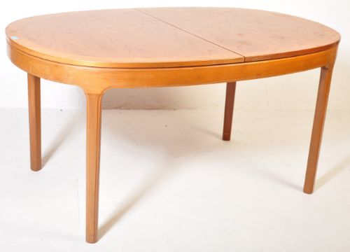 Nathan - British Modern Design - A retro vintage mid 20th century teak extendable dining table of oval form having a single folding leaf within raised on upright supports.